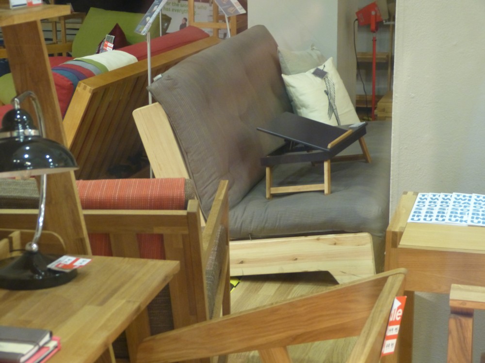 Yesterday evening, just as the place was closing, I spotted (and took bad photos of) a promising sofa, hiding in among lots of other clutter in something called the Futon Centre, in Tottenham Court Road: