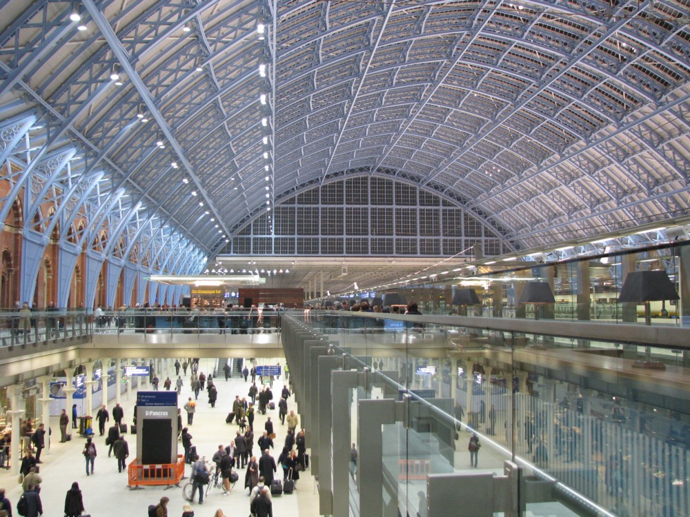 Much of the pleasure of the new station comes from the way it is organised. About two thirds of the old shed is the new Euro-station, but alongside that is the publicly accessible bit, on your left as you enter, full of shops and coffee bars, with its sunken rectangular areas, bridges, stairs and colonnades. And then, beyond all that shopaholic bliss, again on the left, is ... a regular British railway station, with trains going to unmemorable places like Derby and Leicester, and maybe even to exactly those places. I can’t remember. Presumably that would be the old LMS main line. The point being that the Euro-trains are twice the length of regular local trains, which means that the short Brit trains make room for all that shopping. That enabled them to shove the old station completely into the new extension, using the original station only for the Euro-trains.